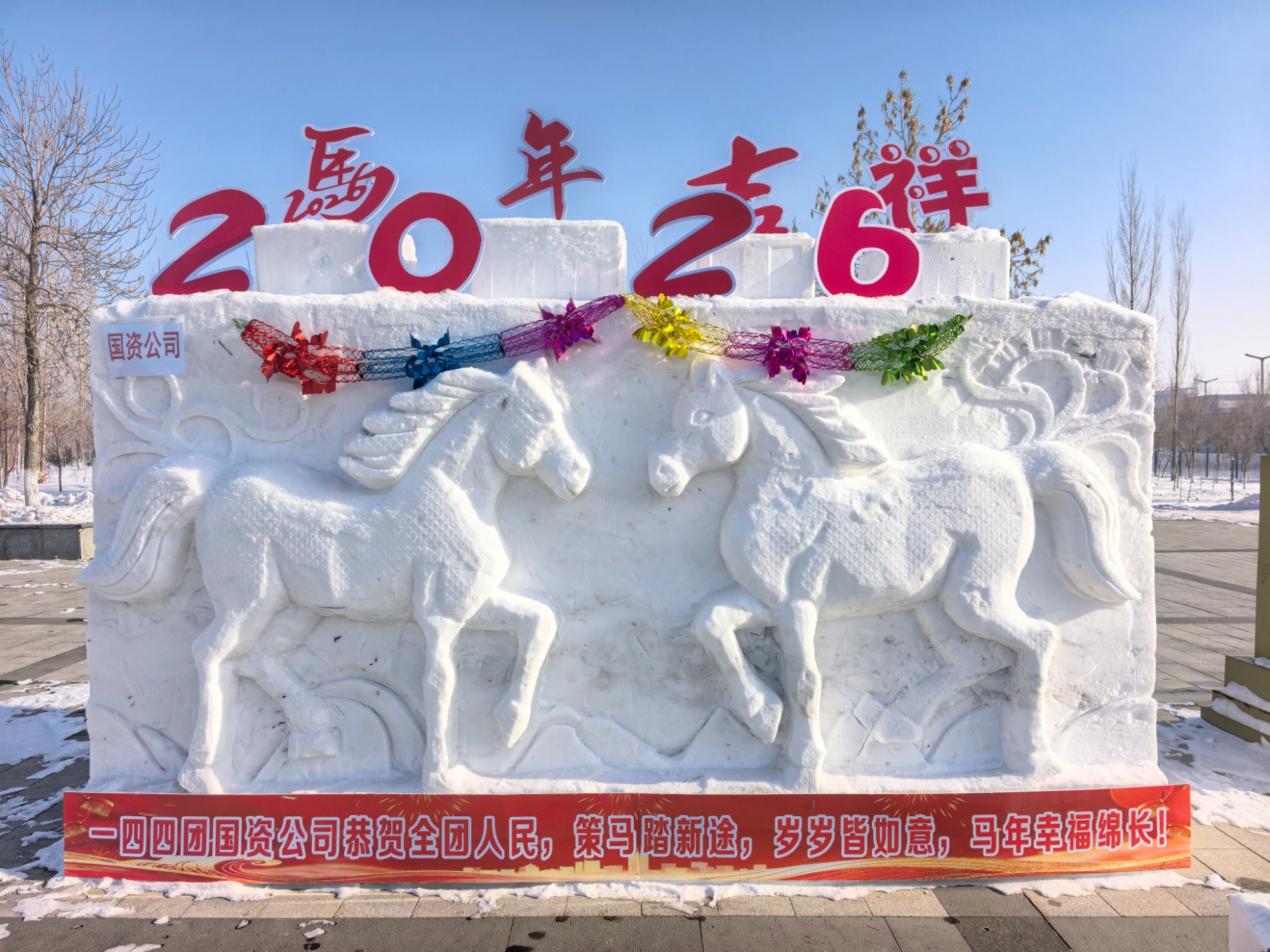 雪雕作品《驰马迎春》 (张晓琦 摄)