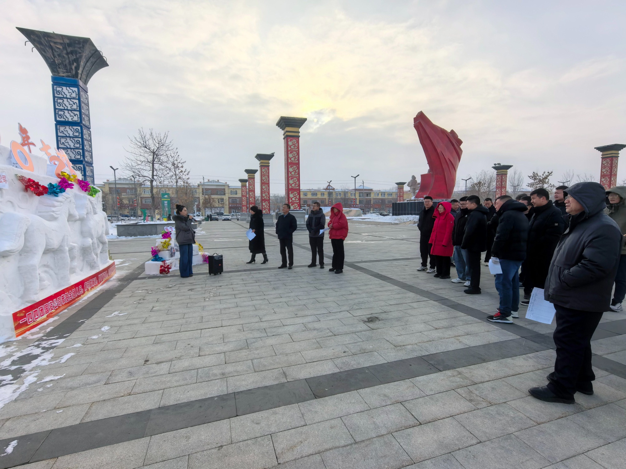评比现场,各基层单位负责人化身“解说员”,逐一阐释作品的创意理念、视觉设计与文化内涵,让冰雪雕塑的“静态美”附上了生动的“故事感”。