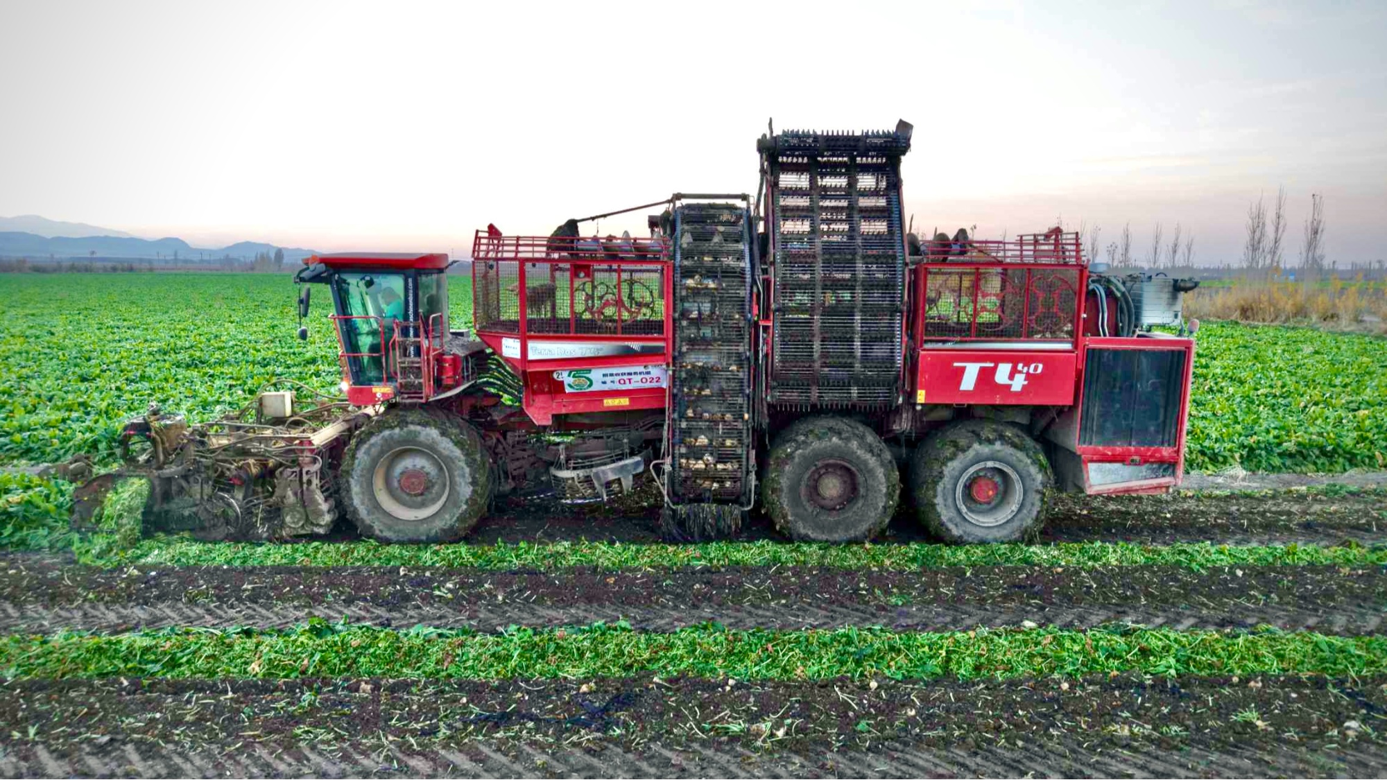 庆阳湖乡双河村甜菜基地里,甜菜采挖机紧锣密鼓地收割 (张鑫源 摄)