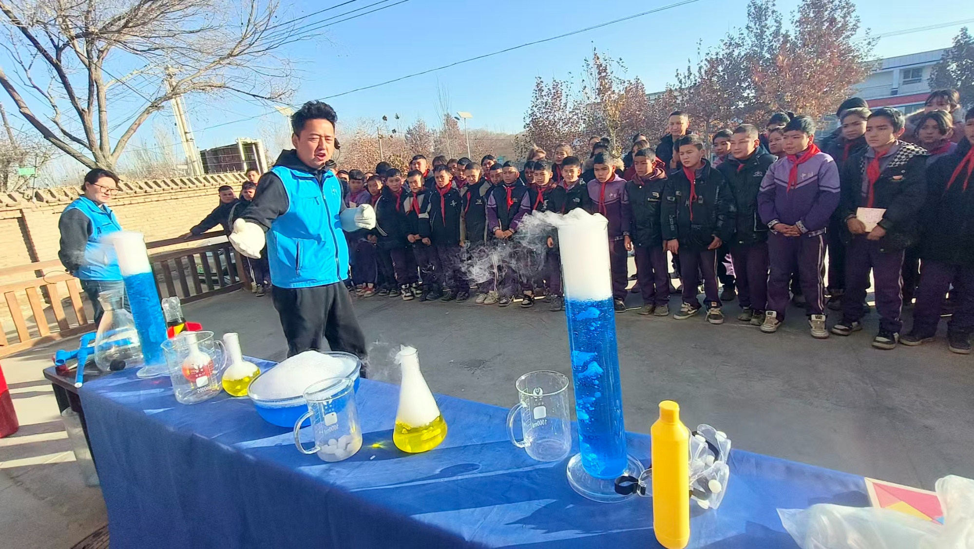 活动当天上午,萨依巴格乡小学的学生们首先走进乡科普馆参观学习,随后沉浸式体验了“云雾仙境”“干冰饮料制作”“干冰枪演示”“酒精迫击炮”“等离子炮”“液氮蘑菇云”等趣味科学实验。神奇的科学现象引发学生们阵阵惊叹,大家踊跃参与、认真观察,在动手体验中解锁科学原理。