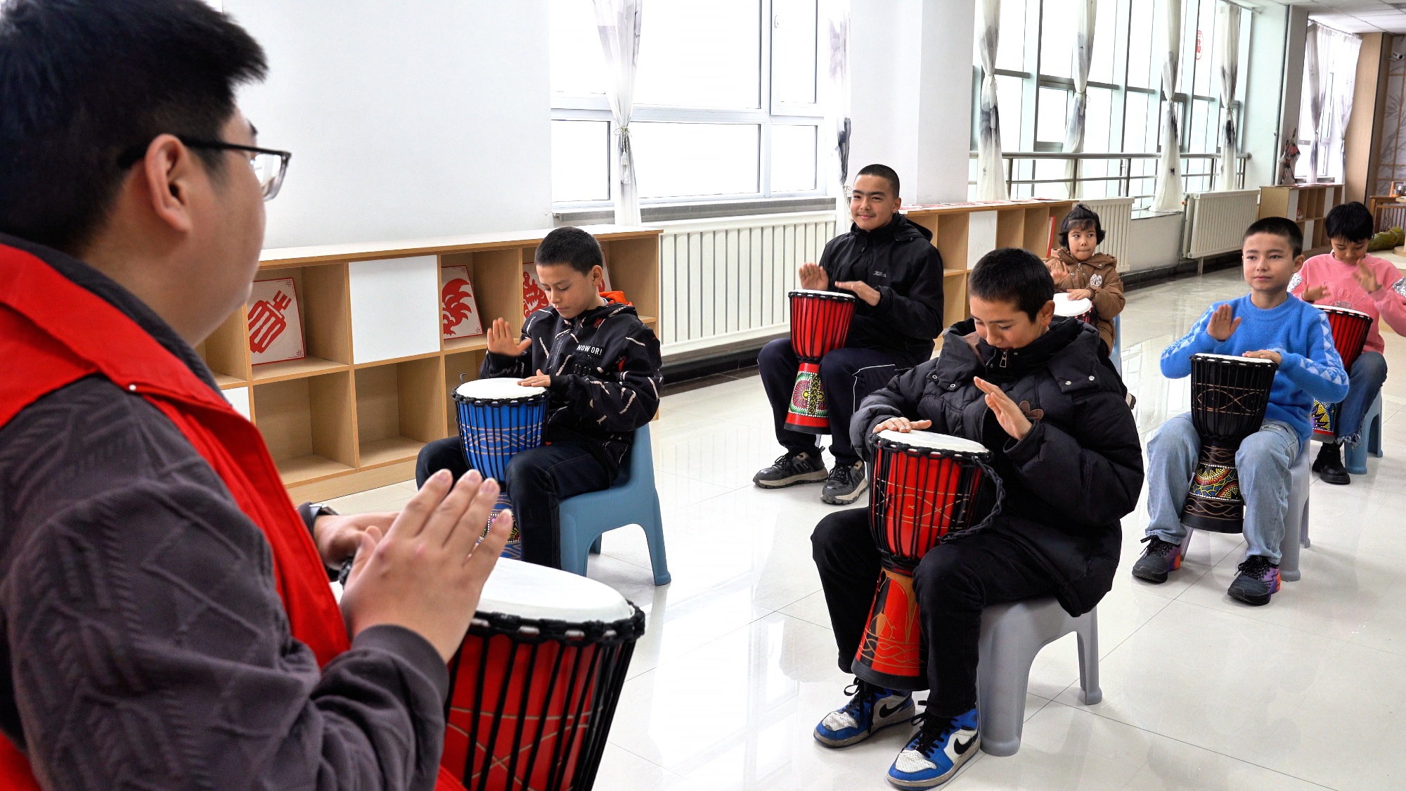与国学课堂的静谧专注不同,社区文化活动室里的非洲鼓课程充满了活力与节奏感。在专业老师的指导下,孩子们整齐地敲击鼓面,脸上洋溢着兴奋。