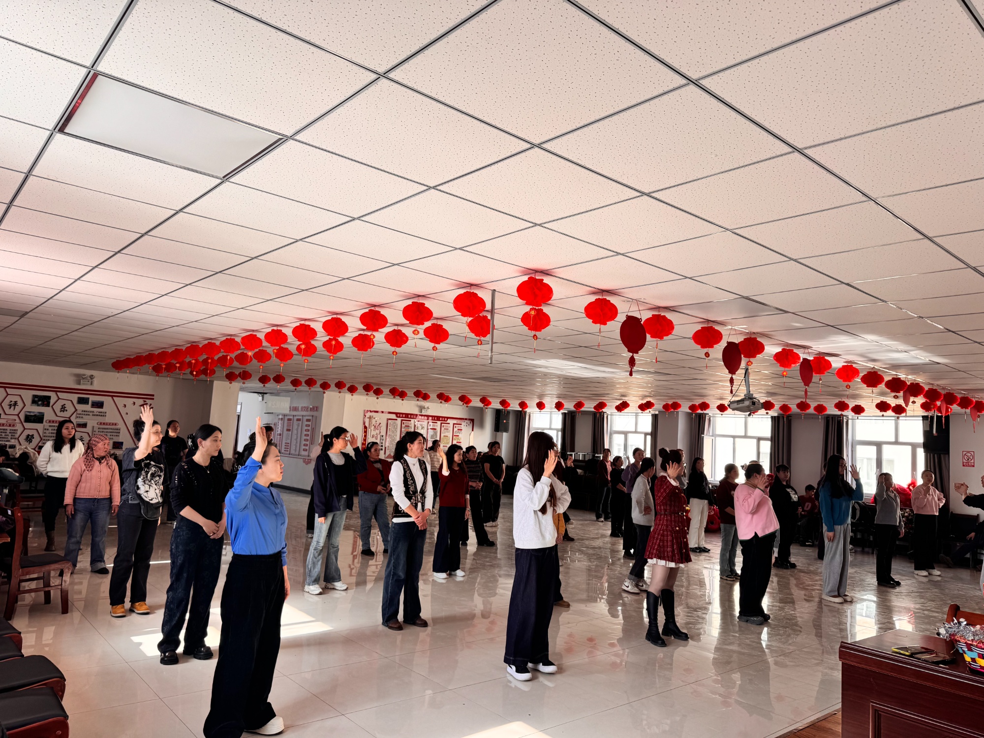 排练现场,欢快的鼓点响彻云霄,热闹非凡。舞狮、秧歌、彩扇舞等经典节目轮番上演。队员们身着色彩艳丽的盛装,踩着鼓点移步换形、默契配合,每一个眼神、每一个动作都透着认真与热忱。