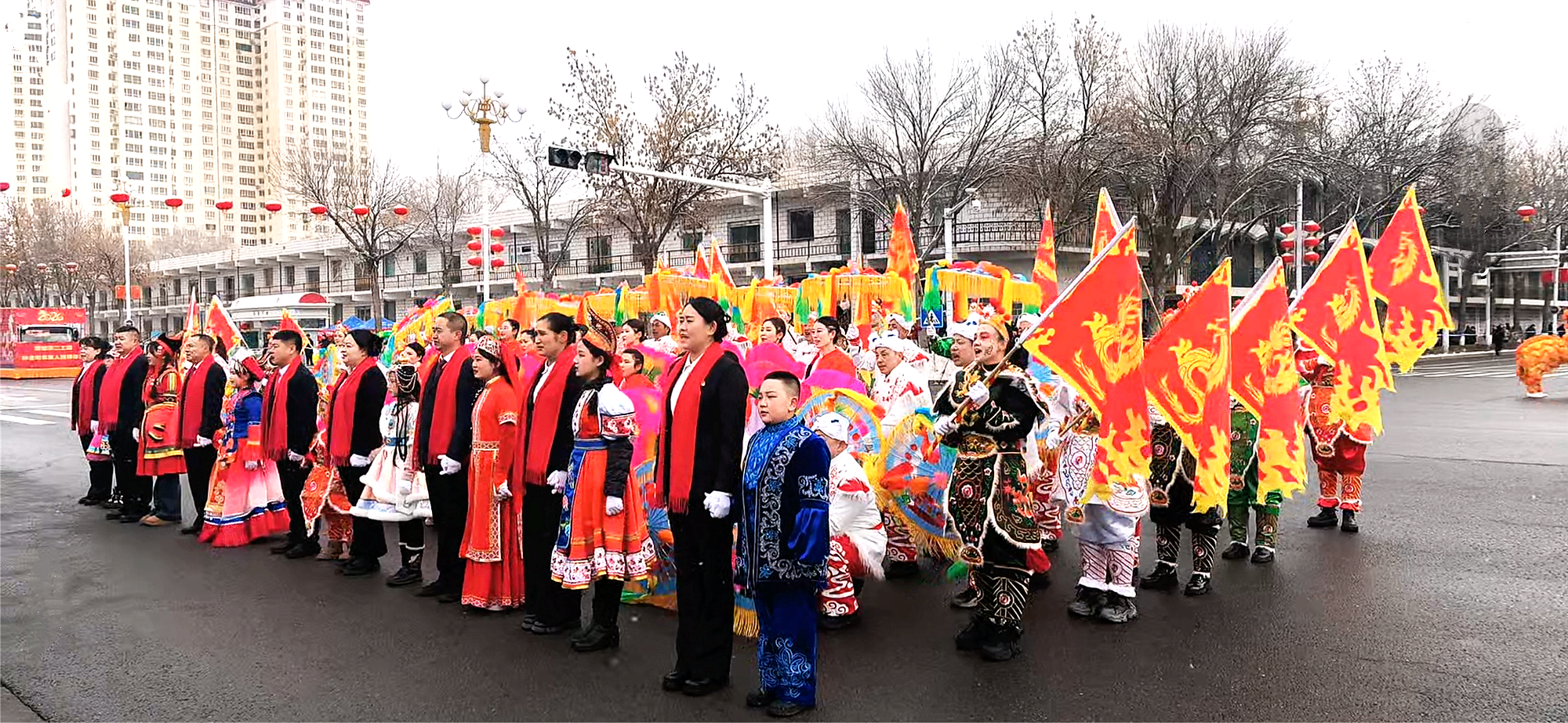 塔城市文化路与新华路丁字路口、新华路与生产街十字路口、新华路与塔尔巴哈台路十字路口三个展演点位人声鼎沸、热闹非凡,喜庆气息扑面而来。
