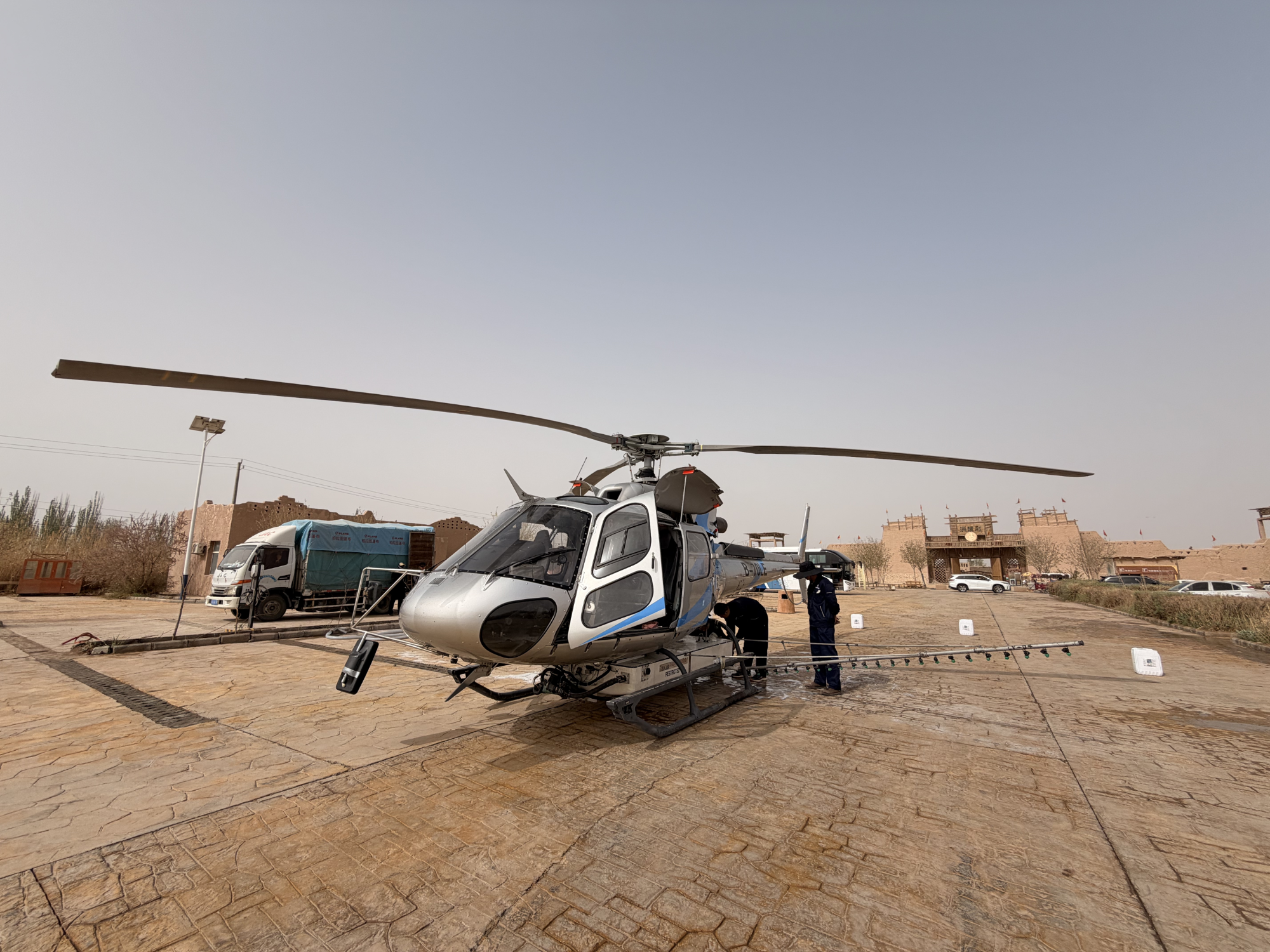 在红海景区飞防作业现场,搭载着高效、低毒、低残留生物药剂的专业防治直升机,按照提前规划的精准航线,保持低空匀速飞行状态,将药剂雾化成细密雾滴,均匀喷洒在万亩胡杨树冠与湿地植被之上,为整片林区披上了一层无形的“生态防护衣”。