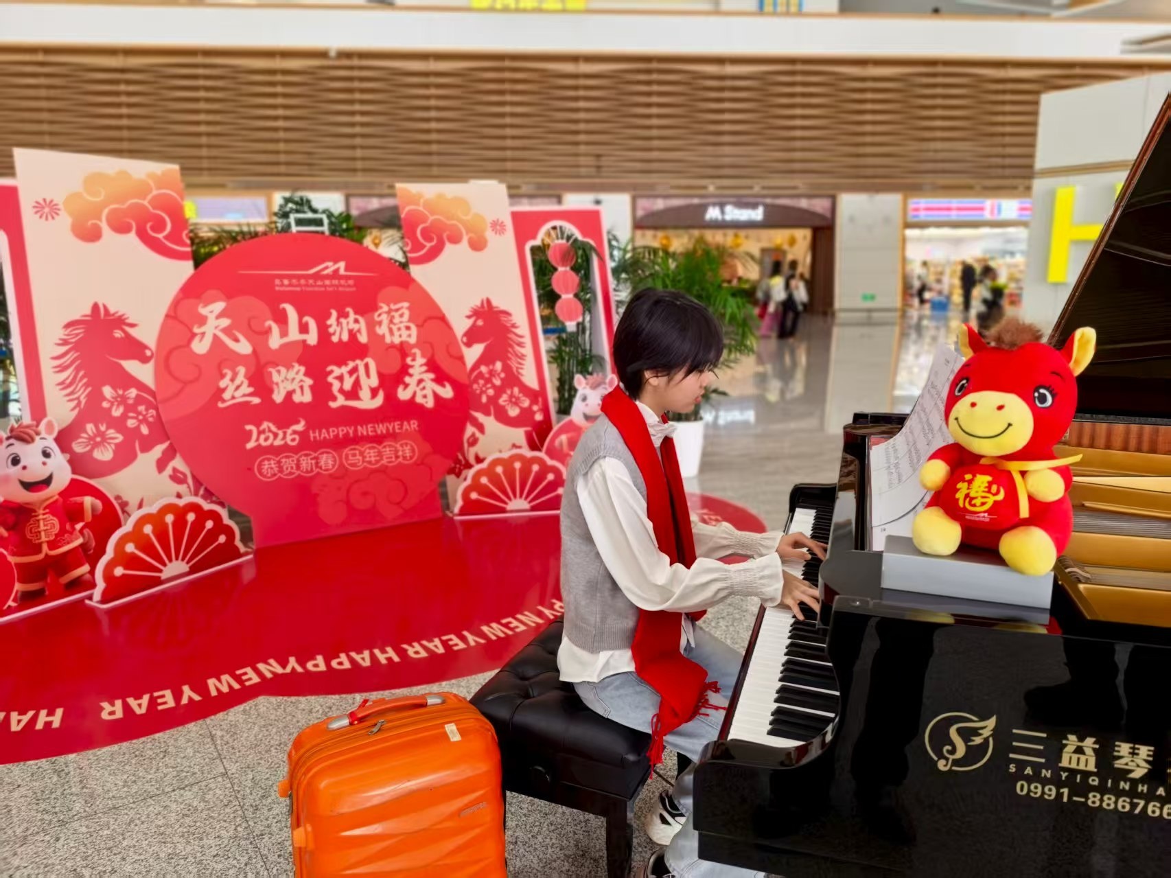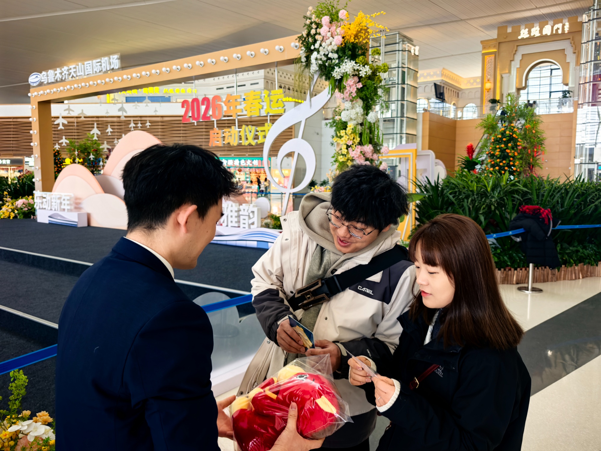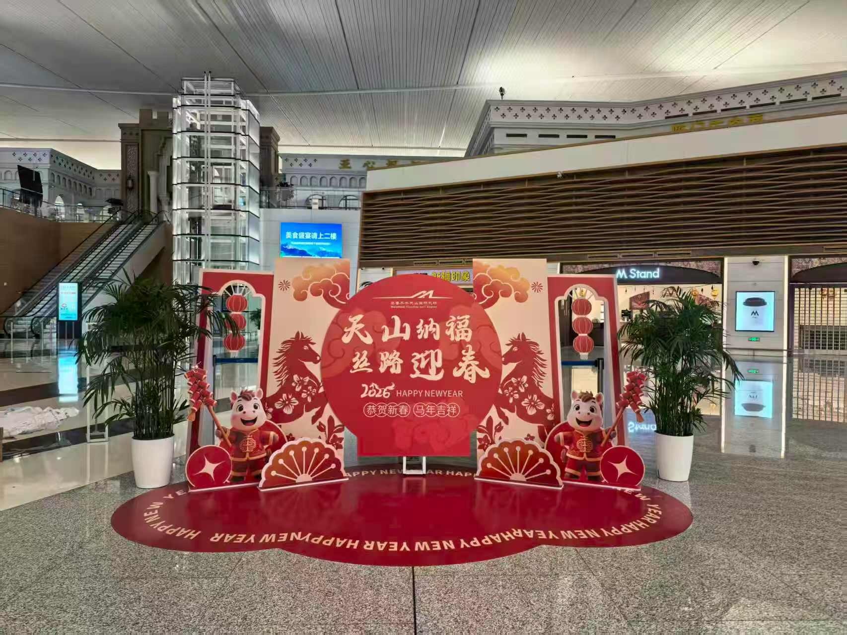 打造沉浸式体验,丝路年味点亮春运旅途。为让旅客在春运途中感受浓郁的新春氛围,乌鲁木齐国际机场分公司服管委以“天山纳福·丝路迎春”为主题,完成航站楼全域春节氛围营造,7处融合传统年味与新疆地域特色的美陈打卡点精彩亮相,将天山风情与新春元素巧妙融合,为旅客打造沉浸式新春出行体验。同时,以航站楼“钢琴角”为特色载体,开展春节主题文化活动,为往来旅客送上专属新春祝福与暖心礼遇,在丰富航站楼文化内涵的同时,让旅客在归途中邂逅温暖与美好,让春运之路成为充满年味的幸福旅程。