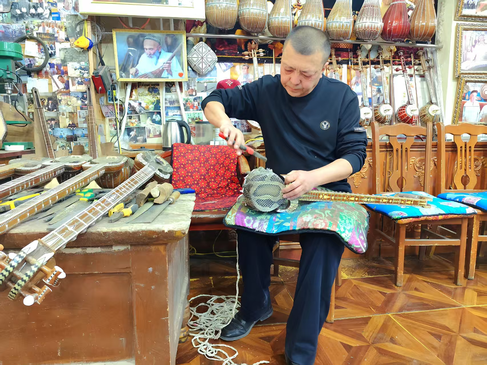 在政策加持下,麦麦提依明·阿巴拜克热的家族坚持手工制作的乐器供不应求,梨木、柏木、蛇皮、牛羊骨等天然原料经匠人之手,变成承载民族文化的艺术品,既传承了非遗技艺,也让“百年老店”的招牌成为吸引游客的金字名片。