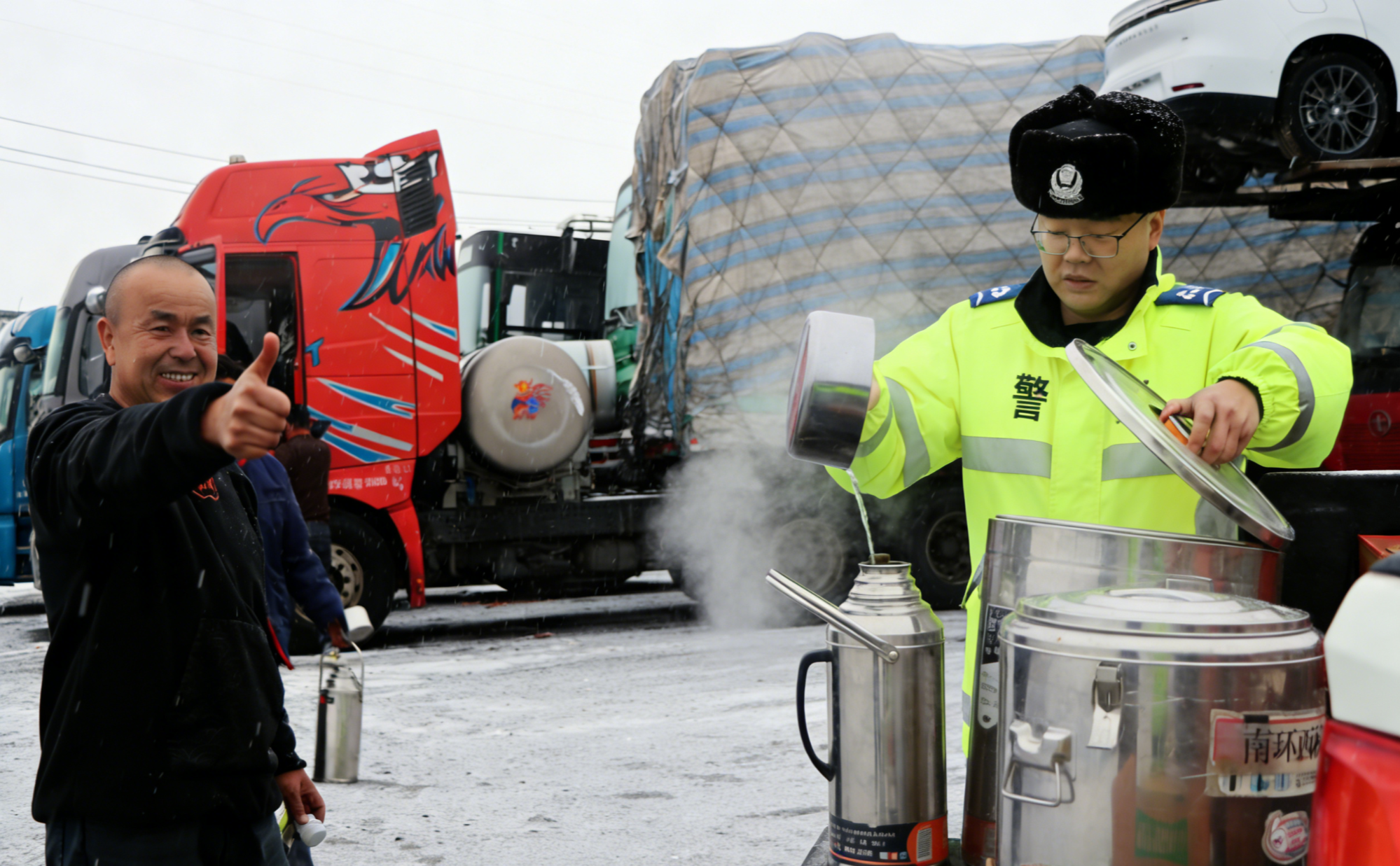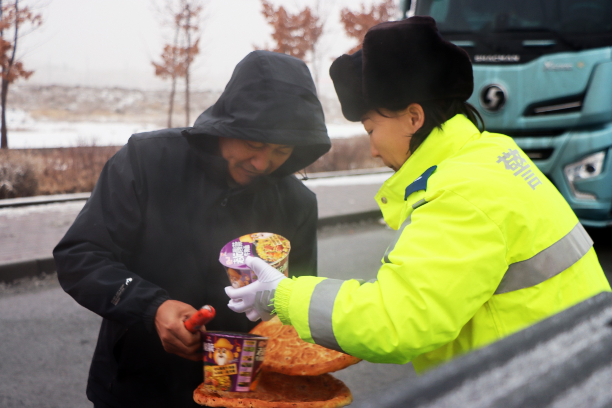 为保障滞留司机的基本生活需求,奎屯交警积极协调相关部门,紧急筹集热水、方便面、馕、保暖手套等物资,穿梭在车流中,把温暖送到每一位司机手中。即便他们双手冻得通红僵硬,脸颊被寒风刮得刺痛难忍,却始终面带微笑:“只要师傅们吃得暖,我们苦点累点都值得。”