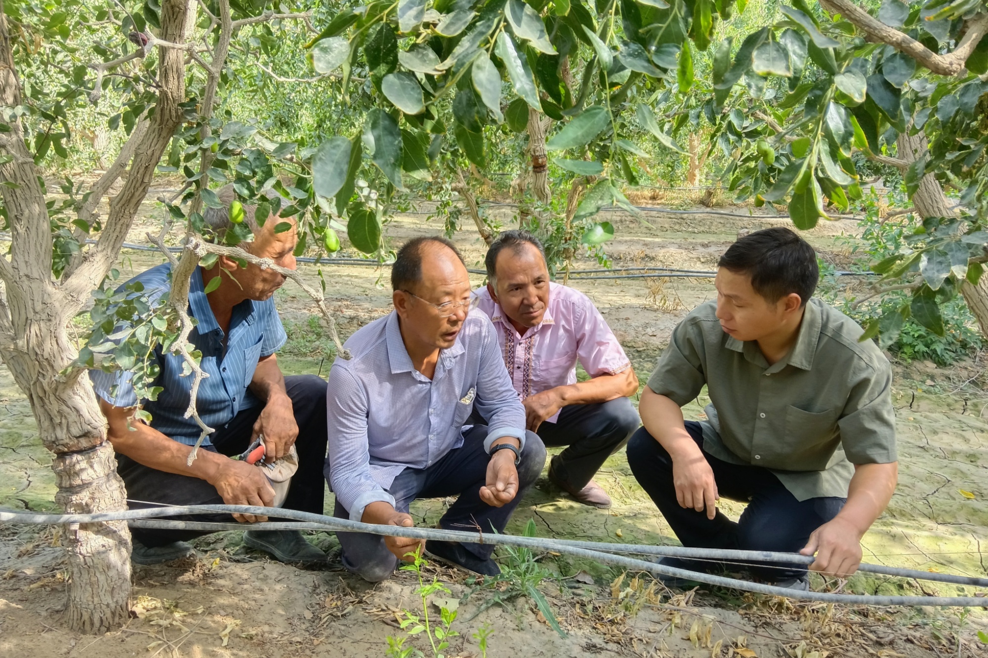 工作人员查看枣园情况 (若羌县融媒体中心供图)