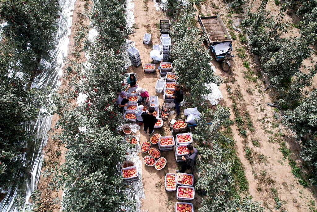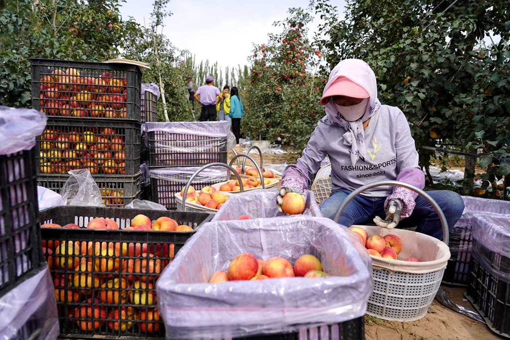 科技赋能让丰收的果实更快走向市场。在温宿县佳木镇落户新疆咸恒农业科技有限公司的苹果种植基地,果农们高要求的采摘、分类和转运等作业正在有序进行。他们手法娴熟地托住果实轻轻一旋,带着果柄的苹果便完好落入掌中,随后按照严格标准将苹果分为特级、一级和二级。经验丰富的技术员们只需一眼一摸,就能准确判断苹果的成熟度。采摘下的苹果被小心放入铺有软垫的果筐,由电动转运车平稳运往预冷库,整个流程如行云流水,既保证了效率,更确保了每一颗秦脆苹果的完美品质。