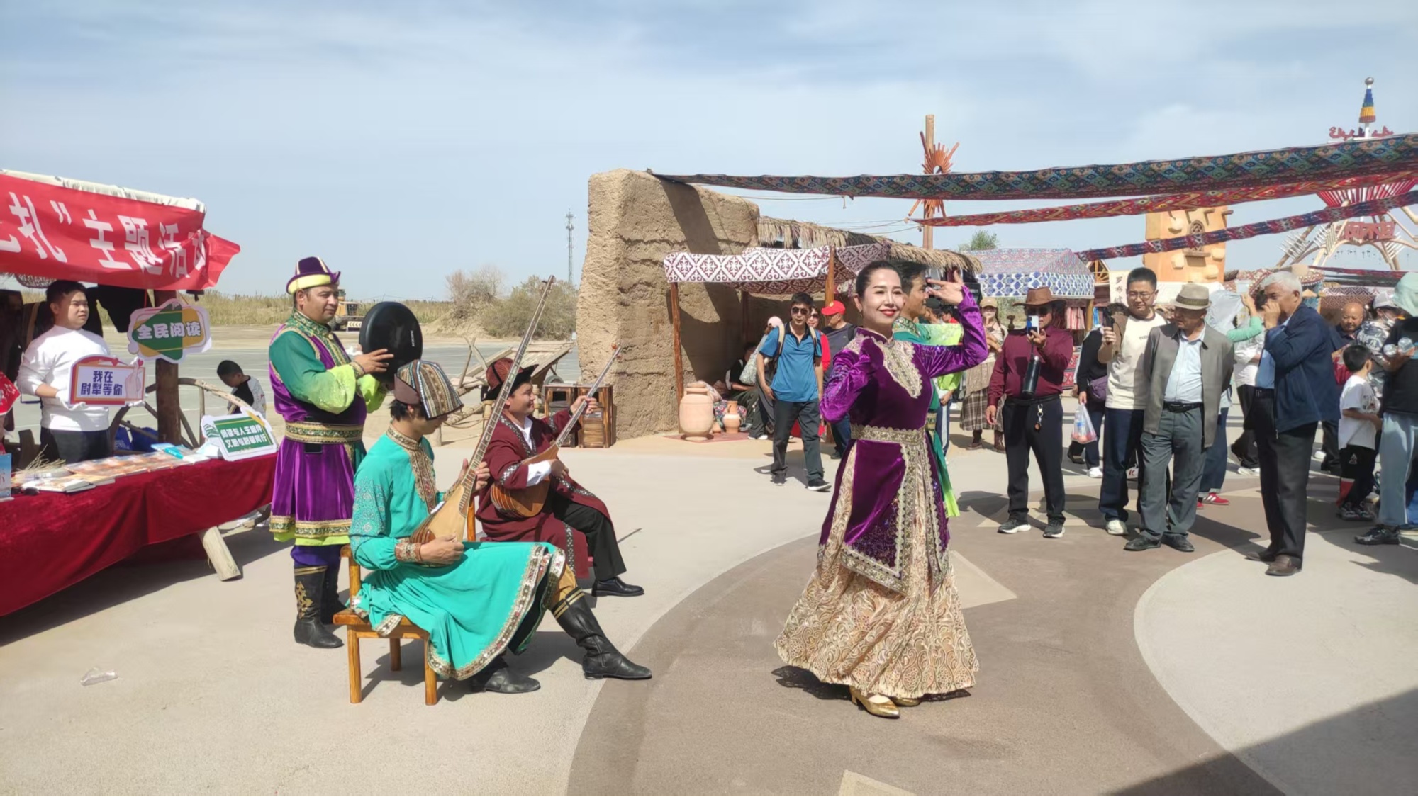 文旅局“最美非遗传承人”曼苏尔江·艾尼瓦尔带来国家级非物质文化遗产弹唱《请到罗布淖尔来做客》,悠扬的旋律吸引众多游客或驻足聆听或手舞足蹈,受到游客喜爱。他说:“罗布淖尔民歌是罗布人的传统歌唱形式,作为非物质文化遗产传承人,我们希望有更多人领略到非遗的魅力。”