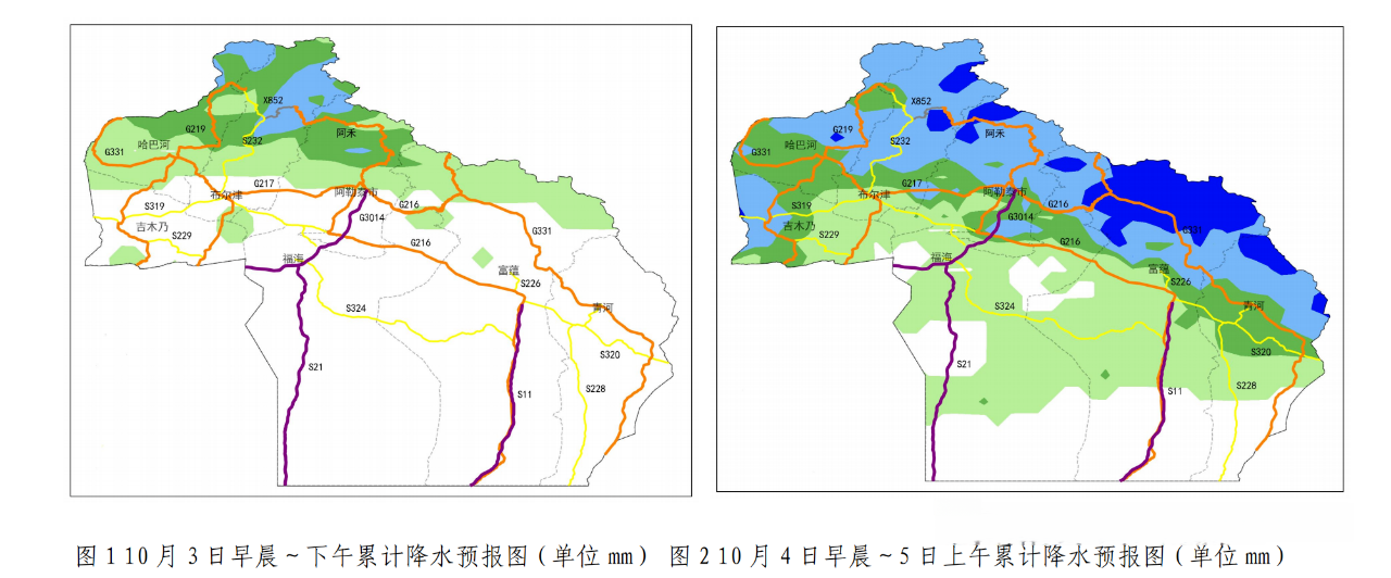 4日夜间到5日白天,阿勒泰地区和塔城地区、克拉玛依市、昌吉州山区、南疆西部山区、昆仑山北坡等地的部分区域有小雨(山区为雨夹雪或雪),其中阿勒泰地区、喀什地区南部山区、昆仑山北坡等地的局部区域有中到大雨或雪,局地暴雨或雪;哈巴河县铁热克提乡、白哈巴、那仁夏牧场,布尔津县石头房子、贾登峪、喀纳斯、禾木,阿勒泰市 G681 阿禾公路全线,福海县夏牧场、红山嘴口岸,富蕴县北部山区有暴雪(新增积雪 13-18 厘米)。