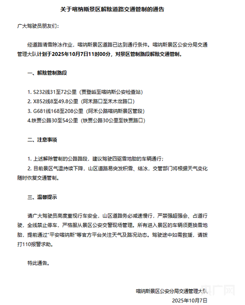 10月7日,喀纳斯景区公安分局交通管理大队发布《关于喀纳斯景区解除道路交通管制的通告》,于2025年10月7日11时00分,对景区管制路段解除交通管制。