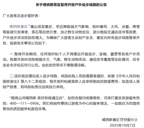 同天,喀纳斯景区管理委员会发布公告,宣布暂停开放徒步线路。
