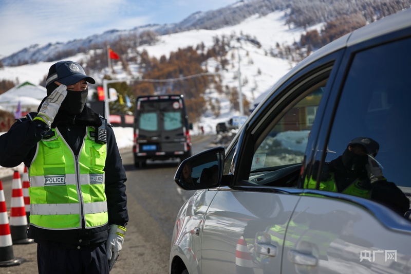 10月7日,喀纳斯景区公安局石头房子执法站交警正在执勤 (央广网发 王友波 摄)