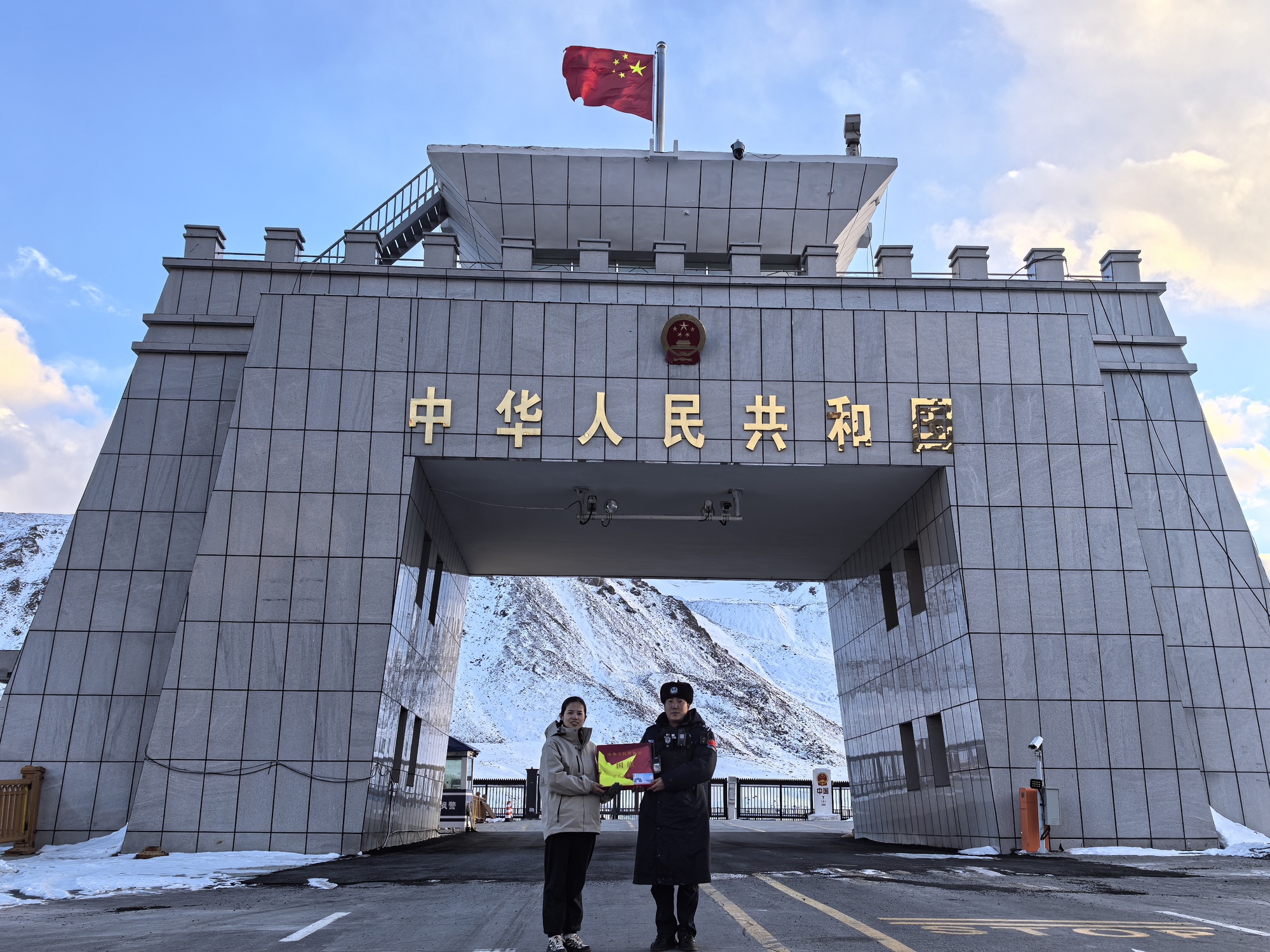 近日,深圳大学援疆支教队在红其拉甫国门收获了一份弥足珍贵的礼物——一面于2025年10月1日在红其拉甫国门升起的五星红旗,这面国旗不仅承载着边疆的厚重历史与戍边精神,更赋予了支教队员们特殊的使命与担当。红其拉甫国门位于海拔5100米的帕米尔高原,这里气候恶劣,寒风凛冽,作为中国与巴基斯坦的边境口岸,红其拉甫国门是国家主权和尊严的象征,被誉为“中国第一国门”。