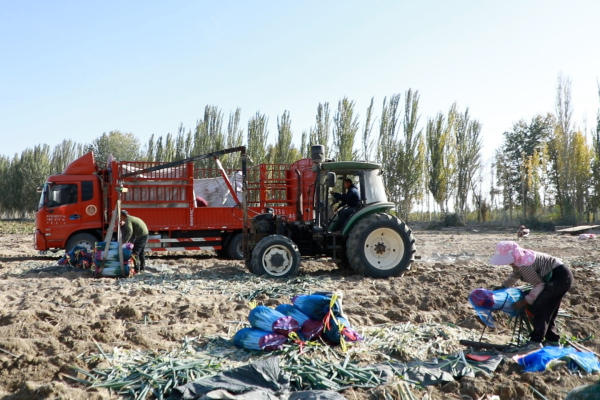 近日,在和田市吉亚乡欧吞其尧勒村种植大户闫统江的大葱地里,机械与人工默契配合,村民们有条不紊地挑拣、捆扎、搬运、装车,带着泥土气息的大葱被陆续运往地头货车上,即将销往本地各市场及阿克苏地区。