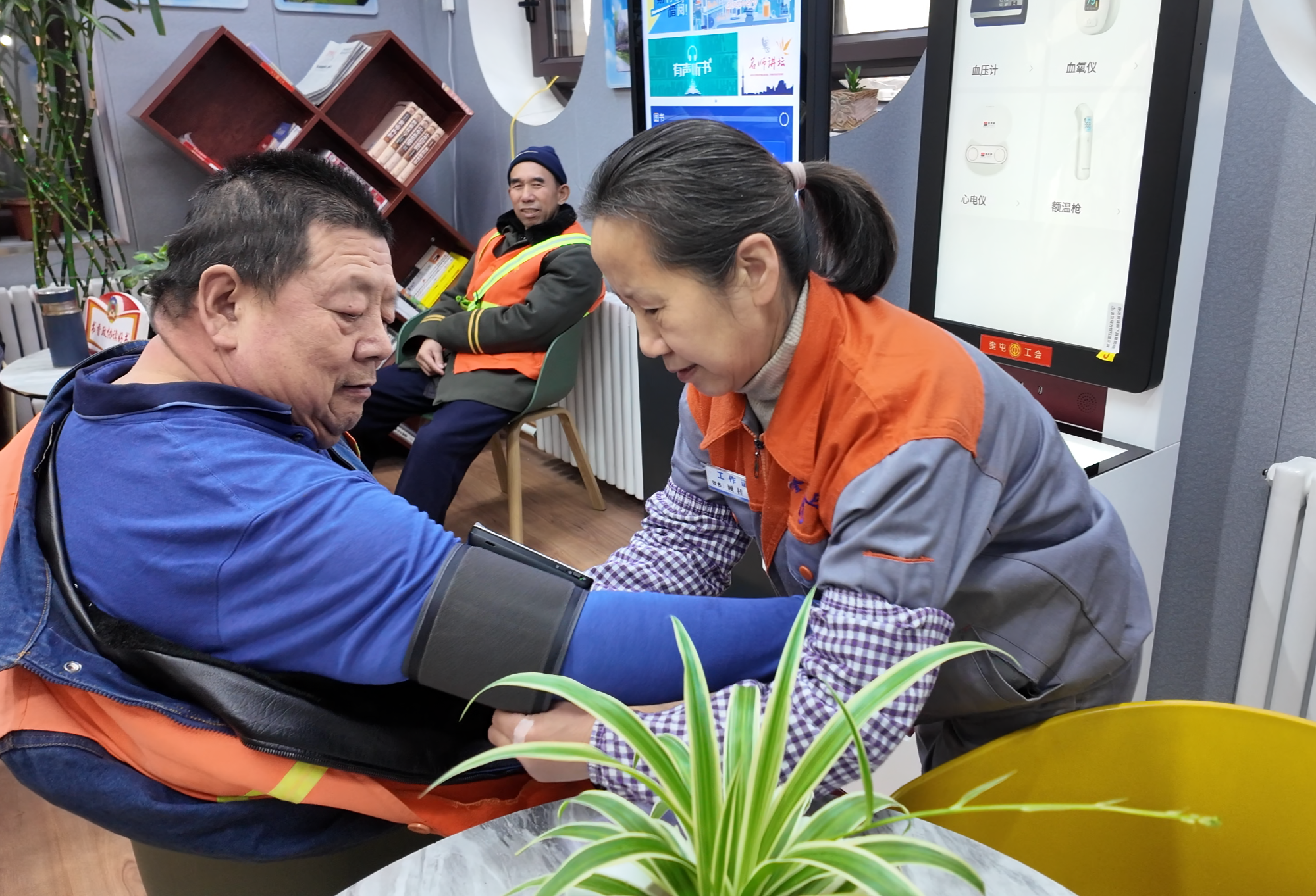 环卫工人张春燕说:“我们干完活儿来这儿,不仅能休息,还能量血压,而且工会驿站提供的设备齐全,让我们很安心,很舒适。”