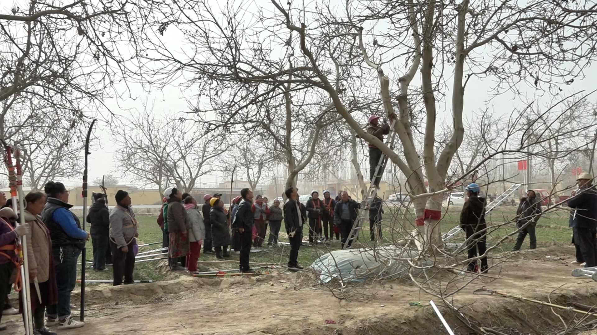 在专业人员指导下,群众有序开展核桃树修剪工作 (麦麦提艾萨·穆萨 摄)