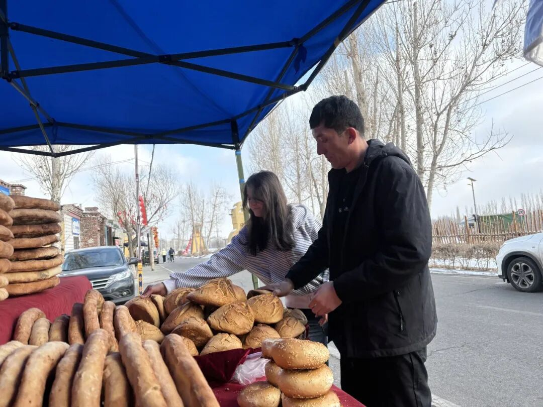 近日,阿里翁白新村一家馕店馕饼飘香,游客有序在门口排起长队。负责人苏比努尔一边忙碌地招呼顾客,一边介绍:“我们这里是旅游村,馕店于去年7月营业。现在生意越来越好,特别是春节这几天,游客一天比一天多,馕也卖得特别快。”春节期间,该馕店每日比往常多销售约200个馕。