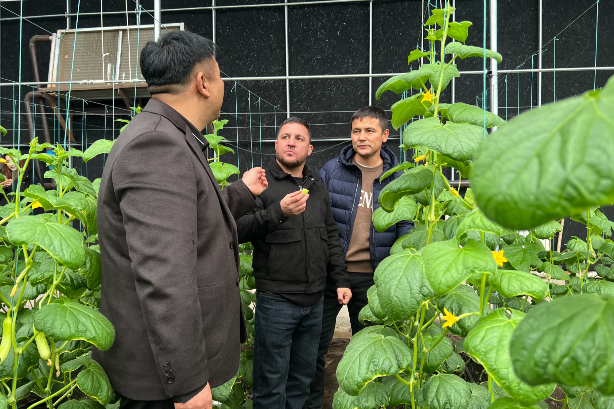 近日,新疆精河工业园区的新疆雪里红农业种植专业合作社的智慧大棚里生机盎然。在挂满果实的蔬菜种植区,客商们俯身仔细查看新鲜采摘的螺丝椒、黄瓜等作物,并就大棚建设成本、亩产规模、种植技术及销售渠道等关键信息,与合作社工作人员进行了深入交流。