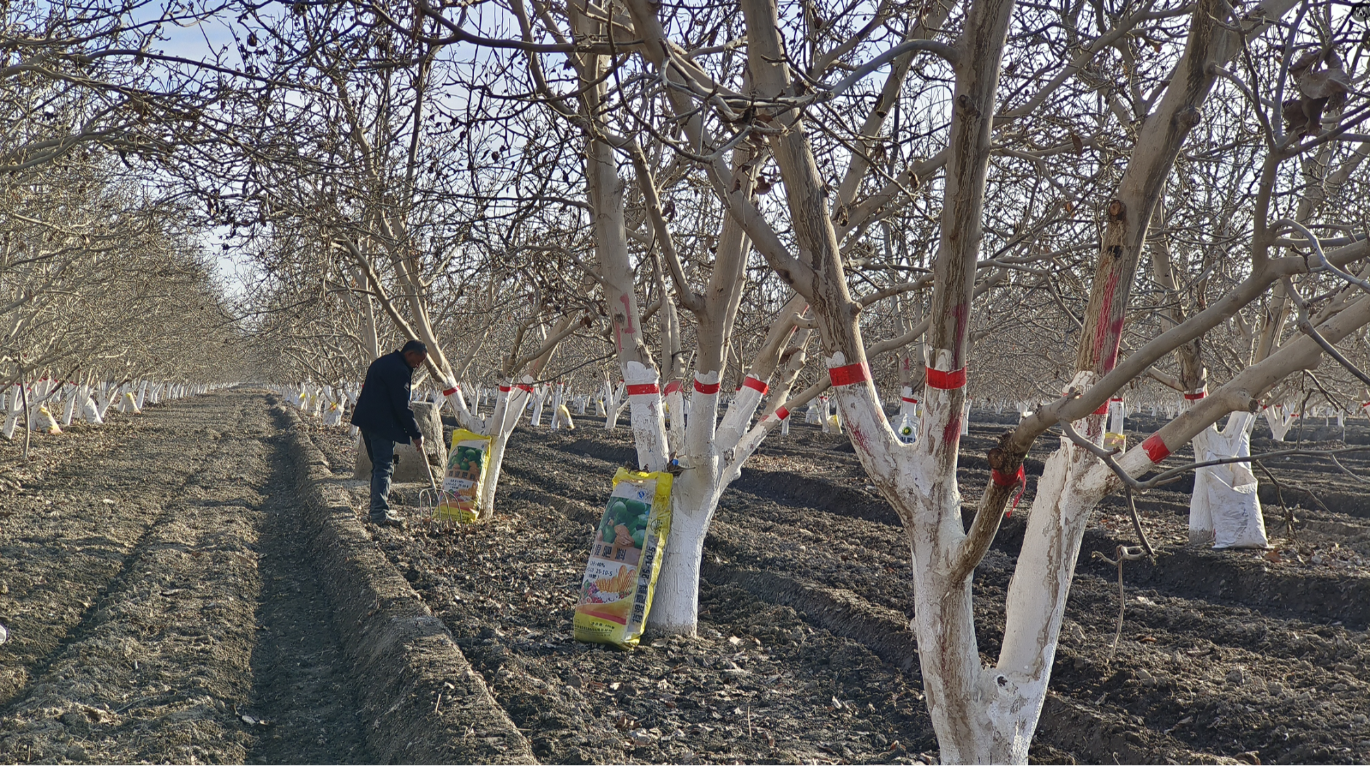 12月1日,在新疆巴楚县阿克萨克马热勒乡乌塘村千亩核桃园,一派热火朝天的劳作景象。果农在乡农技人员的现场指导下,有条不紊地开展林下清园、熏烟炉搭建、树干涂白等冬季管护作业,为核桃树安全越冬筑牢“防护网”,为来年丰产增收夯实基础。