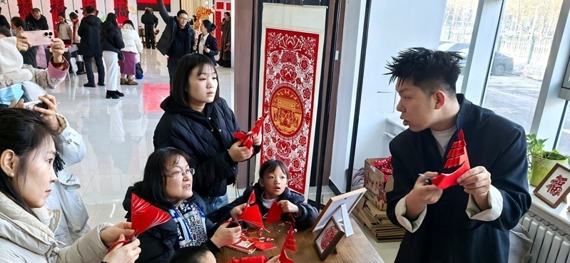 市民在工作人员的引导下,体验传统剪纸艺术 (张亮 摄)