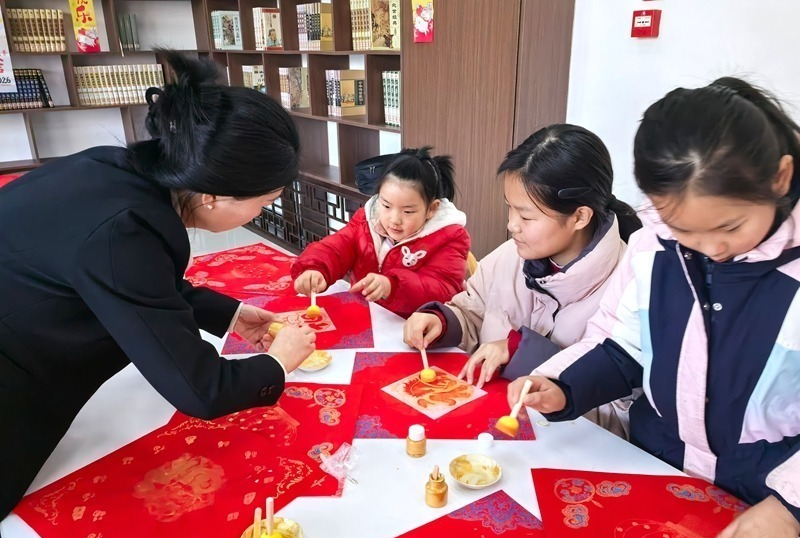 小朋友们在工作人员的引导下,体验拓印“福”字 (何荣 摄)