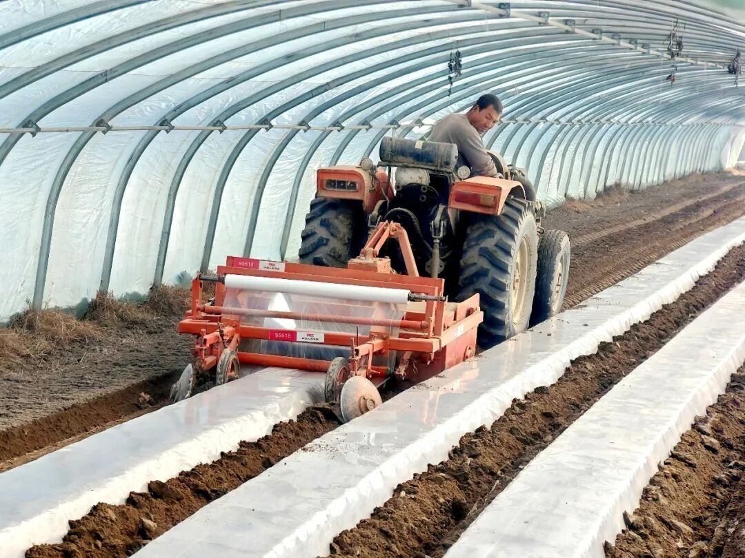 近日,在城关乡兰干村设施农业种植区,连片拱棚整齐排列,棚内机器轰鸣声不绝于耳,拖拉机牵引着旋耕机、覆膜机来回穿梭作业。所过之处,一条条笔直规范的田垄立即成形,保湿地膜覆盖其上,为即将开展的播种做足准备。