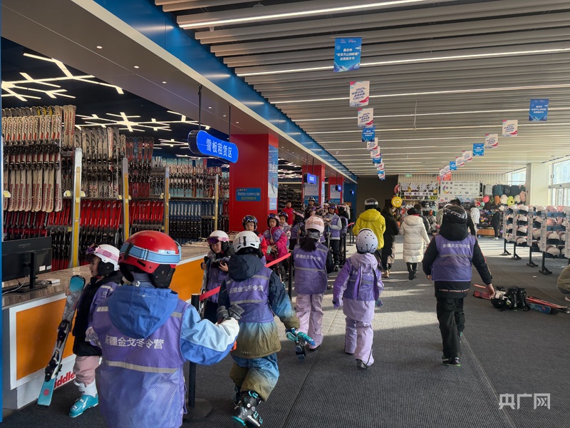 孩子们在教练的带领下领取雪具 (央广网记者 丁安 摄)