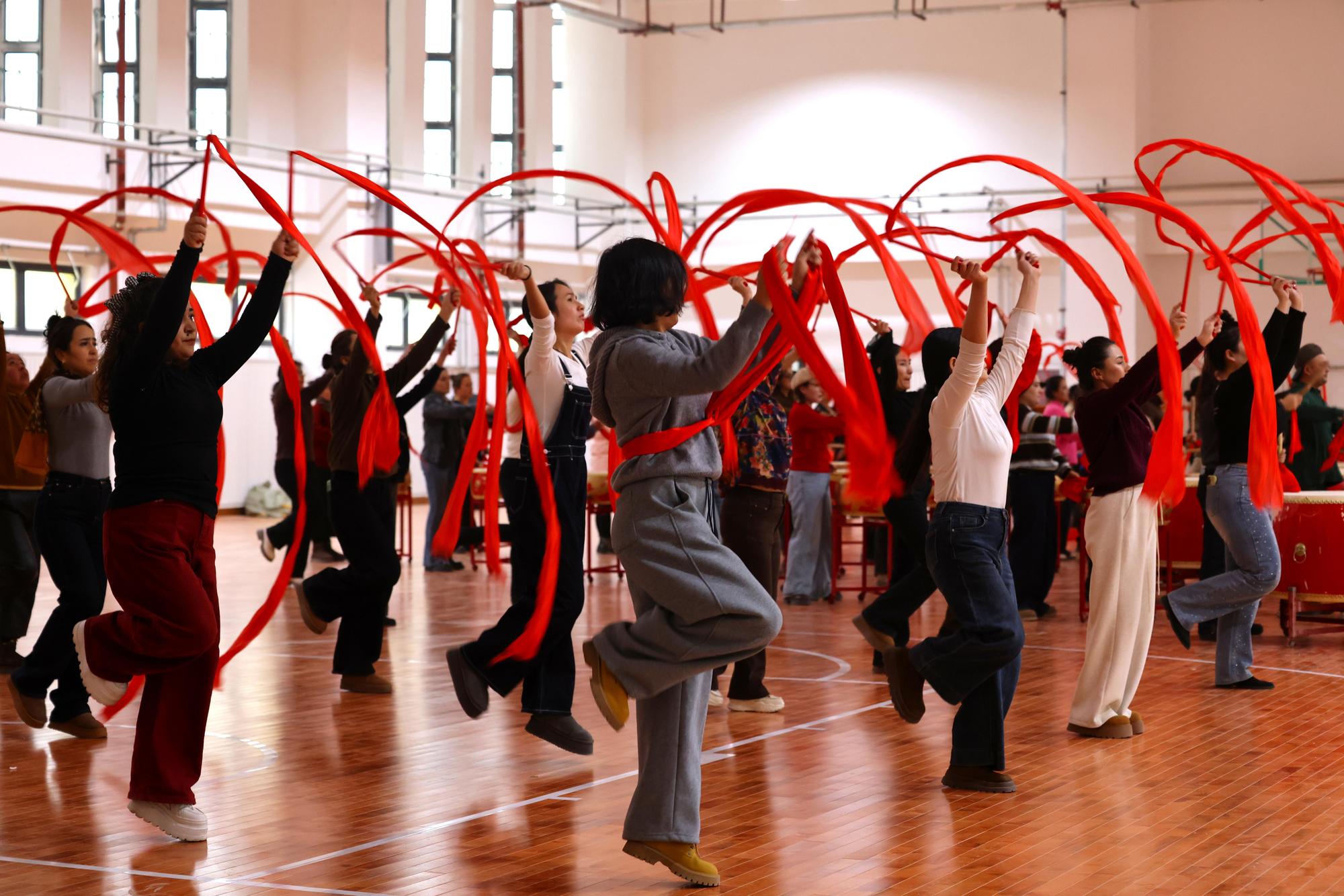 在教育系统的排练现场,队员们以优美舞姿为纽带,将中华优秀传统文化与社火表演深度融合,举手投足间既有民俗典雅韵味,又具有新时代青春活力。排练间隙,各族师生围坐交流技巧、纠正细节,在精益求精中传承文化根脉,让中华优秀传统文化在年轻一代焕发新生。