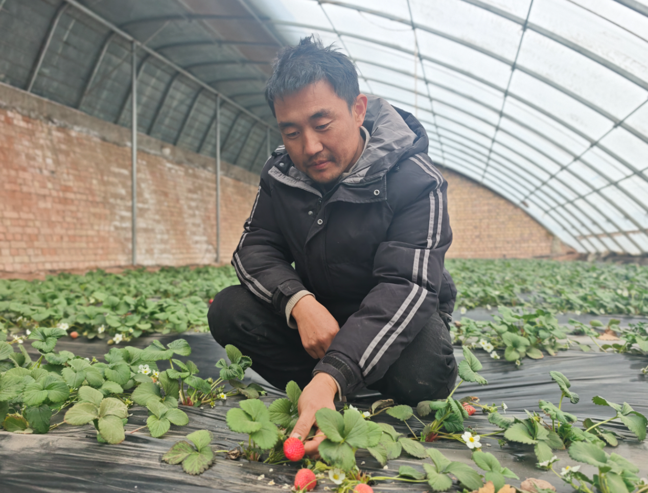 草莓大棚负责人孙川查看草莓长势 (地里夏提 摄)